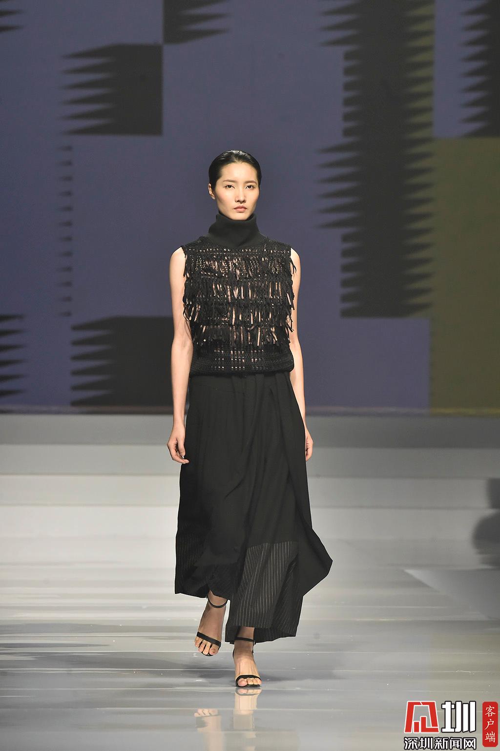 時(shí)裝優(yōu)秀學(xué)生組展示環(huán)節(jié),設(shè)計(jì)師肖榕作品,其作品以純黑色系為主