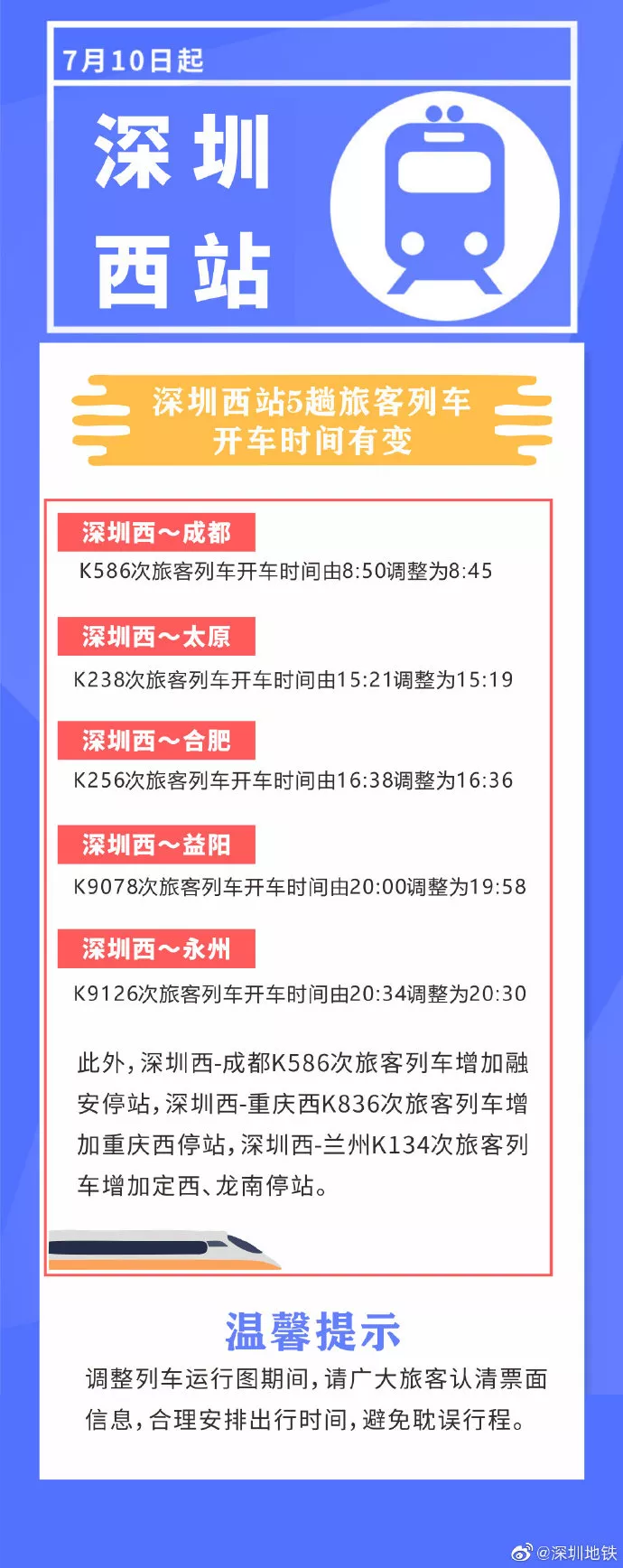 深圳西站5趟旅客列車(chē)開(kāi)車(chē)時(shí)間有變