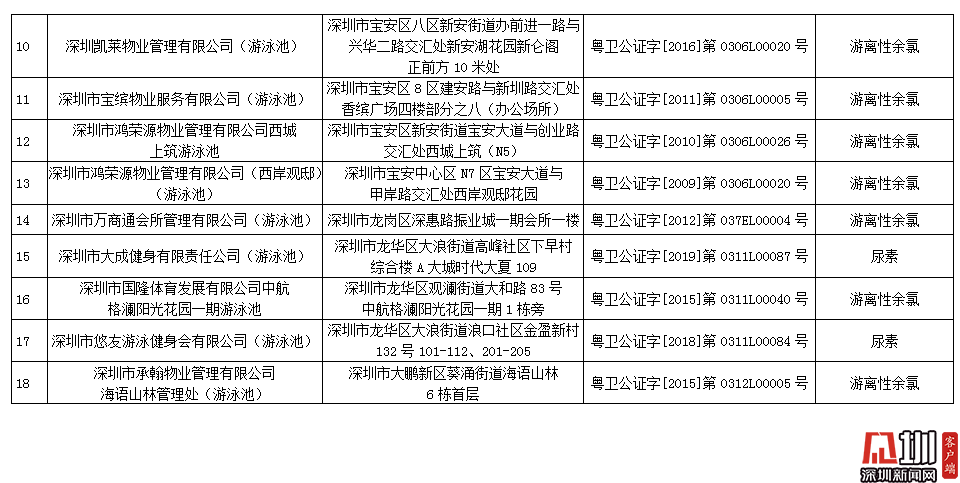 記者獲悉,深圳市夢(mèng)六健身有限公司(游泳池)pH值和游離性余氯指標(biāo)不合格,深圳市百利行物業(yè)發(fā)展有限公司中信紅樹(shù)灣花城物業(yè)管理處(游泳池)、深圳市大成健身有限責(zé)任公司(游泳池)、深圳市悠友游泳健身會(huì)有限公司(游泳池)尿素指標(biāo)不合格,加福投資(深圳)有限公司福朋喜來(lái)登酒店(游泳池)、深圳市蓮花物業(yè)管理有限公司彩田村游泳場(chǎng)、深圳大中華國(guó)際酒店管理有限公司大中華希爾頓酒店(游泳池)、深圳市京基物業(yè)管理有限公司濱河時(shí)代物業(yè)服務(wù)中心(游泳池)、深圳新都酒店股份有限公司新都酒店(游泳池)、深圳陽(yáng)光酒店(游泳池)、深圳市金地物業(yè)管理有限公司翠盈嘉園管理處(游泳池)、深圳凱萊物業(yè)管理有限公司(游泳池)、深圳市寶繽物業(yè)服務(wù)有限公司(游泳池)、深圳市鴻榮源物業(yè)管理有限公司西城上筑游泳池、深圳市鴻榮源物業(yè)管理有限公司(西岸觀?。ㄓ斡境兀⑸钲谑腥f(wàn)商通會(huì)所管理有限公司(游泳池)、深圳市國(guó)隆體育發(fā)展有限公司中航格瀾陽(yáng)光花園一期游泳池、深圳市承翰物業(yè)管理有限公司海語(yǔ)山林管理處(游泳池)游離性余氯指標(biāo)不合格。衛(wèi)生監(jiān)督部門(mén)已責(zé)令抽檢結(jié)果不合格單位立即整改,并跟蹤整改情況。