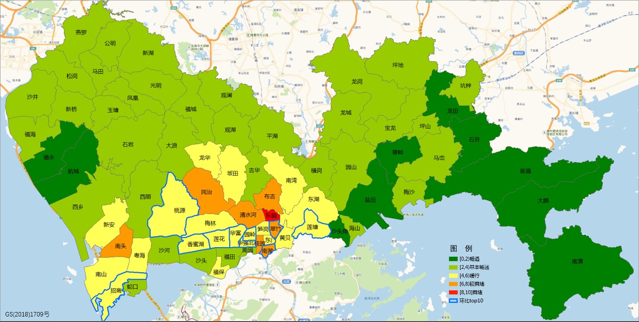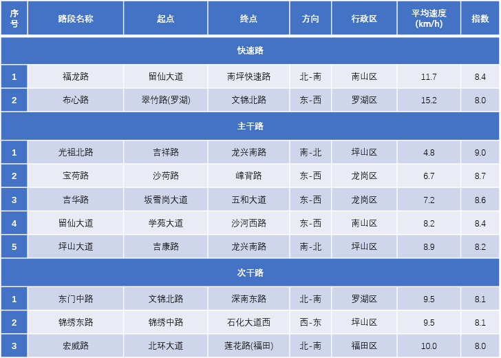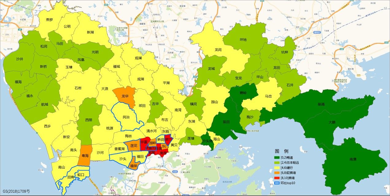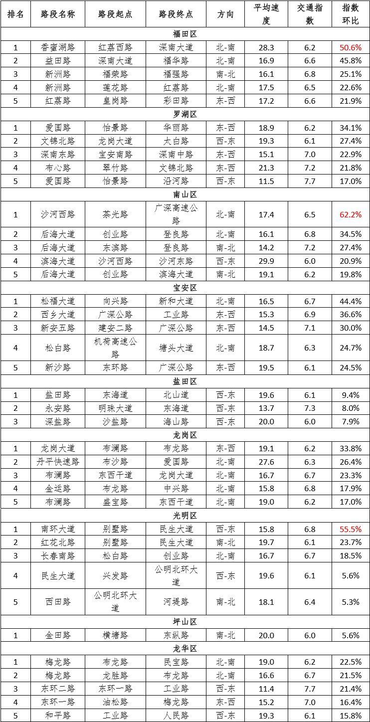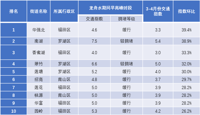 晚高峰十大交通運(yùn)行惡化街道:翠竹、筍崗、福保、蓮花、沙頭、民治、華強(qiáng)北、福田、蛇口、招商。