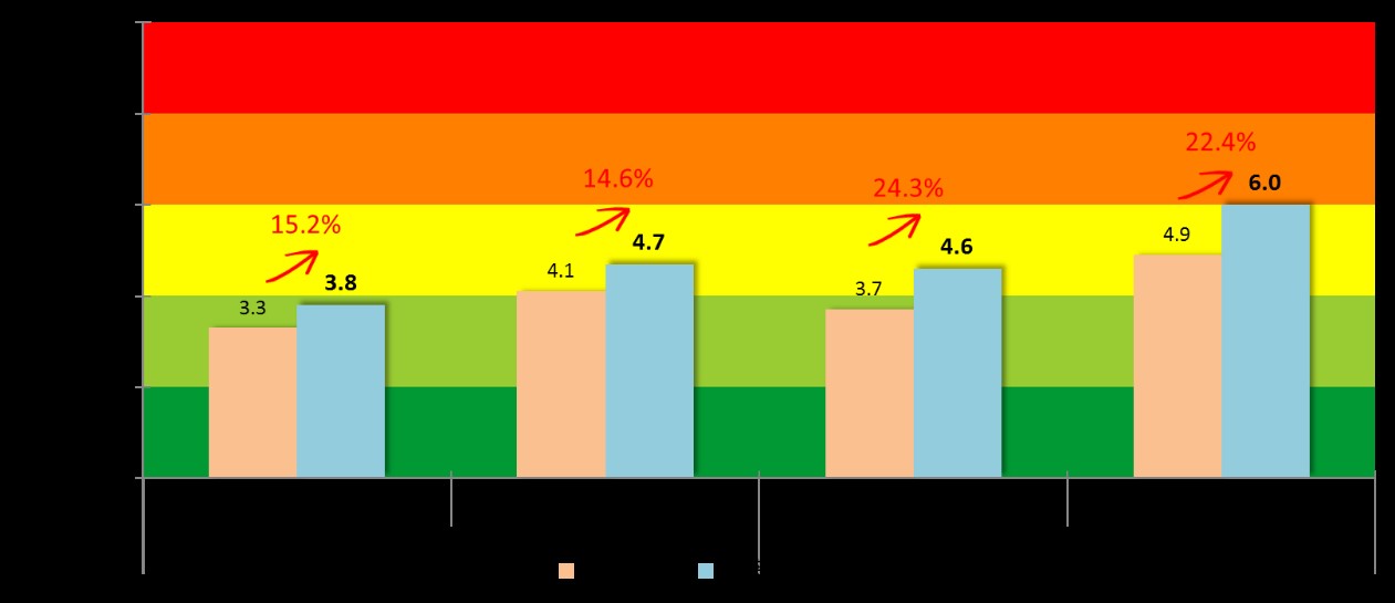 龍舟水期間全市及中心城區(qū)交通運(yùn)行指數(shù)與3-4月份對(duì)比