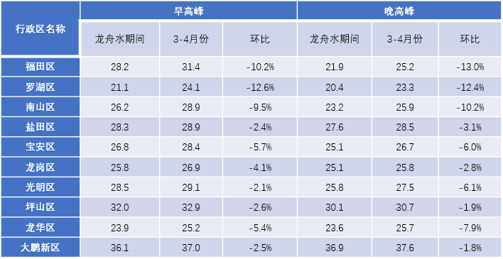 龍舟水期間(5月21日-6月20日),工作日早、晚高峰時(shí)段全市交通運(yùn)行較3-4月份(正常天氣情況)均呈現(xiàn)不同程度惡化,其中中心城區(qū)(福田區(qū)、羅湖區(qū))擁堵惡化明顯。