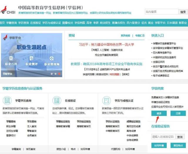 進入學信網網址:http://www.chsi.com.cn/,打開之后點擊下圖提示的地方