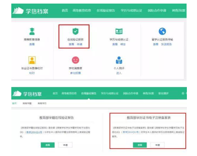 登錄之后,點擊“申請在線驗證報告”,選擇查看《教育部學歷證書電子注冊備案表》。