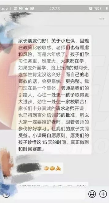 而這個所謂的小課,雖然名義上是“家長自愿”,但老師都放話了,玩得又是“群上接龍”這種“明牌游戲”,又有哪個家長敢公開不給老師面子呢?
