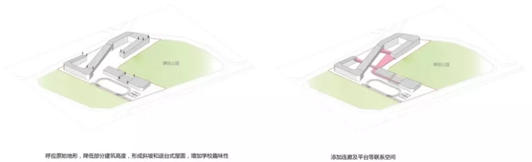 規(guī)劃采用了S型的布局關(guān)系,初中部和小學(xué)部各置一側(cè),各自有相對(duì)獨(dú)立的院落空間的同時(shí),能夠照顧到空間的流通性,使得二者能夠方便地共享公共教學(xué)設(shè)施。