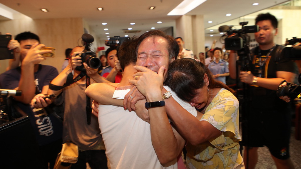7、7月18日上午,在深圳市公安局刑事偵查局和福田分局的幫助下,尋子18年的余氏夫婦在深圳市刑偵局技術處一樓見到了兒子,團聚現(xiàn)場余氏夫婦將兒子緊摟懷中,淚流滿面。