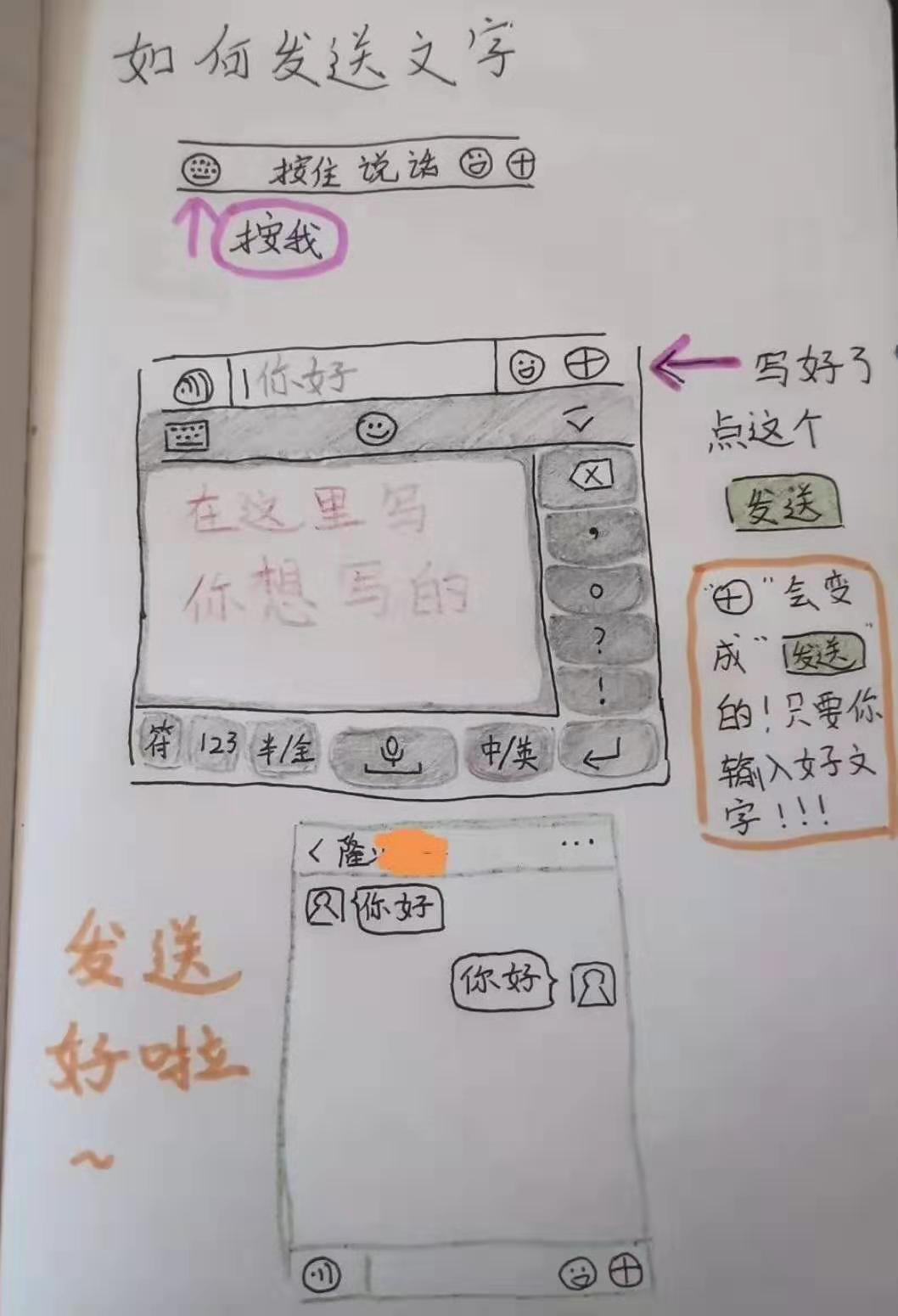 這是其侄女隆沂珊為了教會(huì)奶奶使用社交軟件特別畫的。圖文并茂地記錄了如何發(fā)送語(yǔ)音、如何發(fā)送文字等等,十分通俗易懂。
