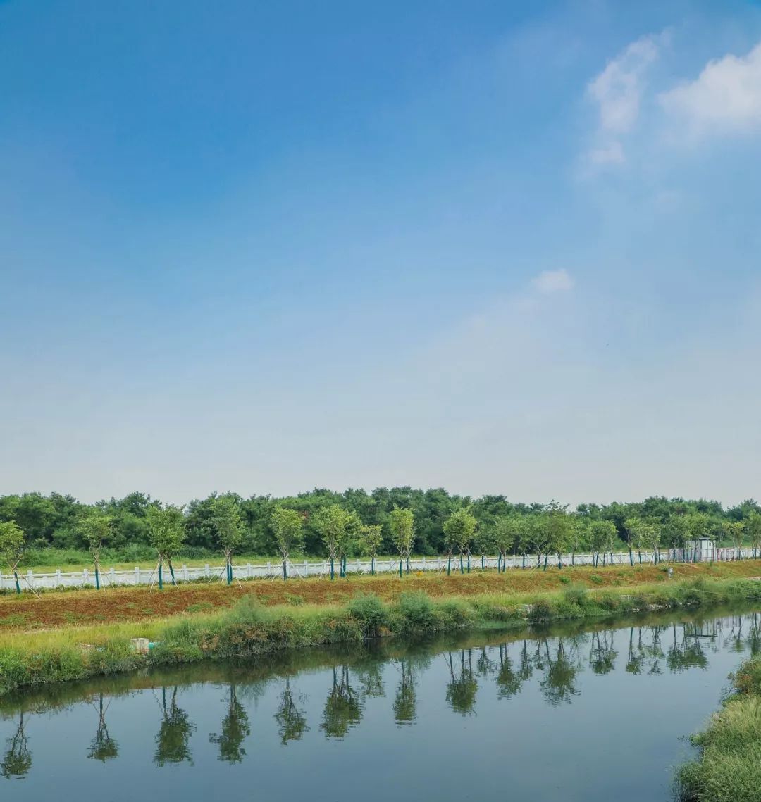 兩岸碧綠的草地和青翠的樹木相依相偎