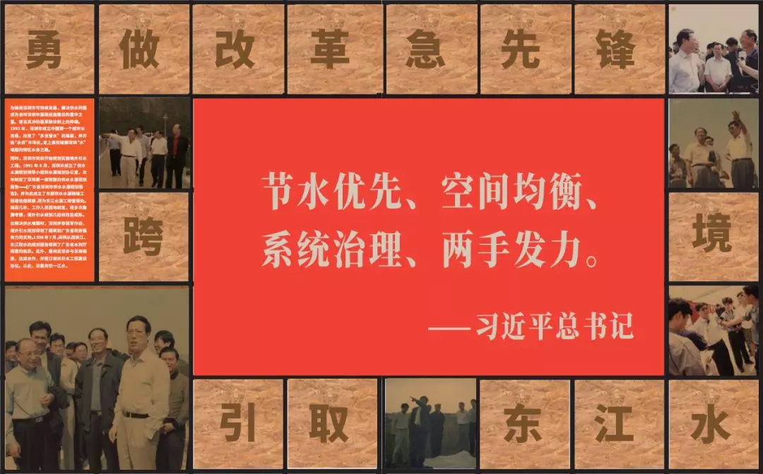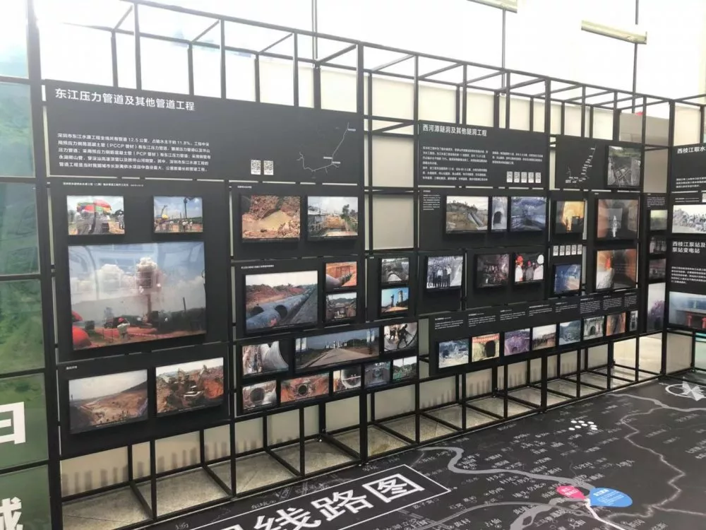 第三部分“清清東江水汩汩入鵬城”,著重展示東江水源工程建設(shè)的全過程。以工程線路為展覽線索,再現(xiàn)水務(wù)工作者在長達(dá)106公里的戰(zhàn)線上奮戰(zhàn)的場(chǎng)面。通過輸水設(shè)施的新舊照片對(duì)比,描繪出一條在深惠兩城平地崛起的深圳“生命線”。