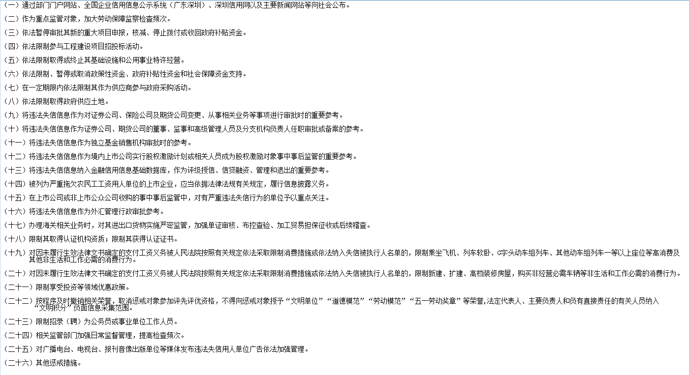 除此之外,深圳還實(shí)施了拖欠農(nóng)民工工資“黑名單”制度。用人單位出現(xiàn)克扣、無故拖欠一名勞動(dòng)者三個(gè)月以上工資報(bào)酬,數(shù)額累計(jì)二萬元以上,且經(jīng)行政處罰(處理)的;克扣、無故拖欠十名以上勞動(dòng)者的勞動(dòng)報(bào)酬且數(shù)額累計(jì)在十萬元以上,且經(jīng)行政處罰(處理)的;涉嫌構(gòu)成拒不支付勞動(dòng)報(bào)酬罪,案件被移送公安機(jī)關(guān),且公安機(jī)關(guān)受理立案的;因拖欠工資違法行為引發(fā)群體性事件、極端事件造成嚴(yán)重不良社會(huì)影響,且經(jīng)行政處罰(處理)的具體情況時(shí),會(huì)被列入黑名單。