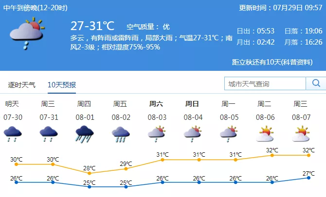 周一至周三有雷陣雨,局部暴雨;周四至周五有一次暴雨降水過程;周末期間(8月3-4日)有陣雨或雷陣雨。