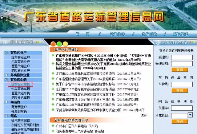 登錄廣東省道路運(yùn)輸管理信息網(wǎng),點(diǎn)擊左側(cè)菜單欄中的「客貨運(yùn)車(chē)輛」,再點(diǎn)擊「客班車(chē)客運(yùn)車(chē)輛」,就能進(jìn)入到查詢(xún)頁(yè)面。