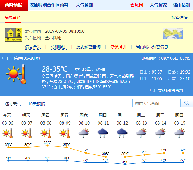 最新的氣象預報顯示,未來4-5天,深圳持續(xù)高溫天氣。8月6-9日受副熱帶高壓和臺風“利奇馬”偏北下沉氣流的影響,深圳市以晴天為主,高溫天氣持續(xù),大部分地區(qū)最高氣溫34-36度,中北部和人口密集區(qū)可達37度或以上;10-11日轉雷陣雨。