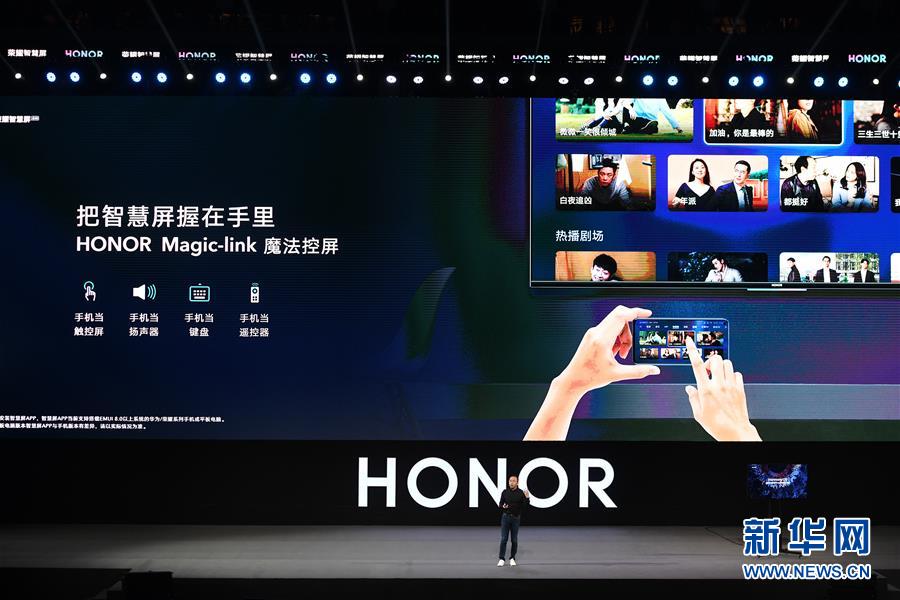 8月10日,華為榮耀總裁趙明在發(fā)布會(huì)上介紹榮耀智慧屏。新華社記者梁旭攝