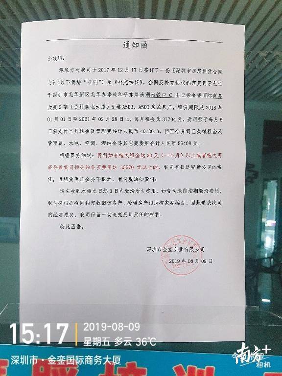 事實上,攸攸舞蹈學(xué)校清湖校區(qū)因“不定期停電影響正常上課”的情況自今年5月30日已出現(xiàn),當(dāng)時即有學(xué)員猜測是校方拖欠租金所致。而8月9日,舞蹈室門外出現(xiàn)了一份落款為深圳市金籃實業(yè)有限公司的通知函,上面顯示該校區(qū)已欠繳租金、管理費、水電等費用總計56408元。足見欠費已持續(xù)一段時間。
