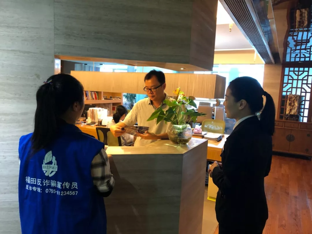 上午10時,深圳市公安局福田分局派出“藍(lán)馬甲”宣傳隊走入大中華國際交易廣場,逐層逐戶向企業(yè)員工們派發(fā)反詐騙宣傳單及《福田反詐騙教育????!八{(lán)馬甲”宣傳隊員走進(jìn)各企業(yè)辦公室,向企業(yè)員工派發(fā)相關(guān)資料,講解反詐騙知識。各企業(yè)員工積極參與,與“藍(lán)馬甲”講師頻頻互動,并認(rèn)真學(xué)習(xí)反詐騙技巧,努力提升自身反詐騙能力。