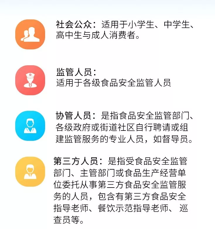 法人/負責人/股東、食品安全管理員、采購員、倉儲管理員、粗加工人員、烹調加工人員、面點糕點制作人員、專間人員、餐具清洗消毒保潔人員、傳菜服務人員、水果飲品制作人員、燒鹵熟食制作人員、食品驗貨崗位、食品留樣、送餐人員等15個崗位。