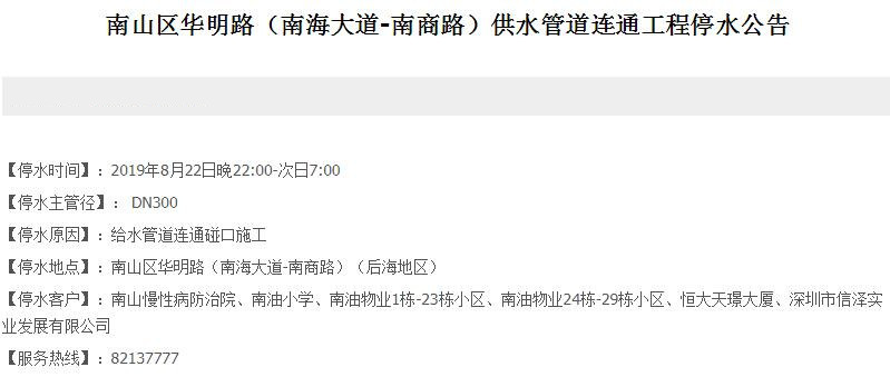 停水客戶:南山慢性病防治院、南油小學、南油物業(yè)1棟-23棟小區(qū)、南油物業(yè)24棟-29棟小區(qū)、恒大天璟大廈、深圳市信澤實業(yè)發(fā)展有限公司