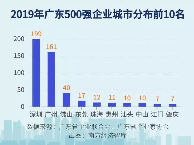 在這份榜單中,500家入選企業(yè)分布于廣東19個城市。其中,超過九成來自珠三角城市,前10強企業(yè)來自廣州、深圳、佛山三市,2018年營業(yè)收入超過1千億的21家企業(yè)同樣來自珠三角,其中深圳11家,廣州6家,佛山2家,珠海和惠州各有1家。