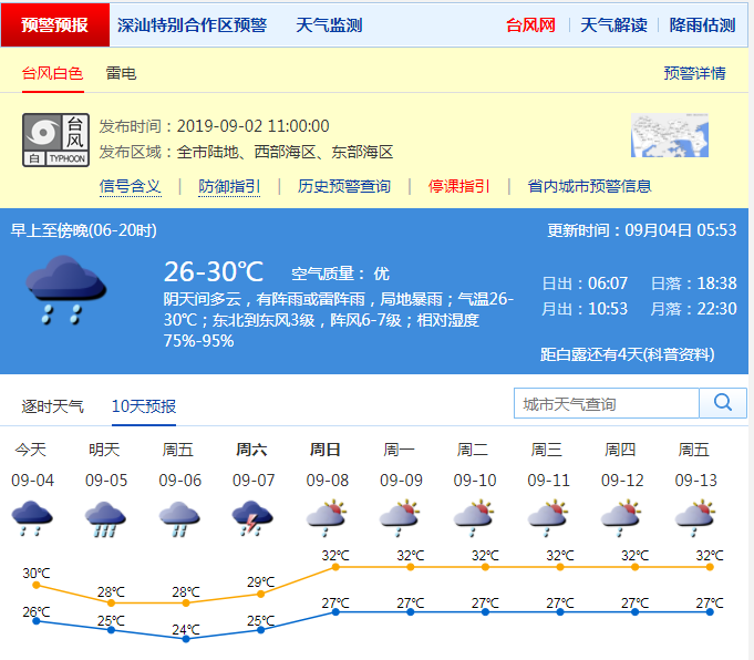 見圳客戶端.深圳新聞網(wǎng)2019年9月4日訊 據(jù)深圳市氣象臺消息,臺風“劍魚”3日17時減弱為熱帶低壓,目前其風力進一步減弱,已很難確定其環(huán)流中心,中央臺4日02時對其停止編號。預計本周深圳多降雨,深圳(含深汕)4-5日有雷陣雨,局部暴雨,沿海和海區(qū)最大陣風6-7級。