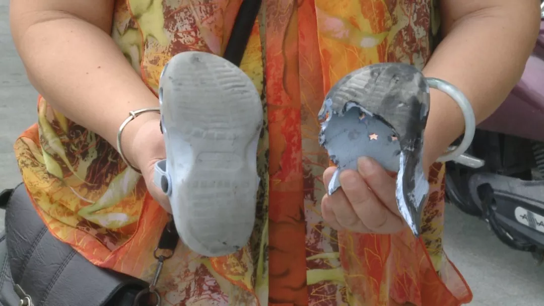 一位過路的市民見狀,按下了電梯緊急停止鍵,李女士這才慢慢幫助兒子脫困。孩子的洞洞鞋,前半截在電梯空隙里被絞斷,只剩下后半截,萬幸的是,小孩沒有受傷。