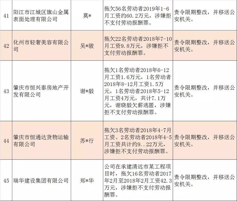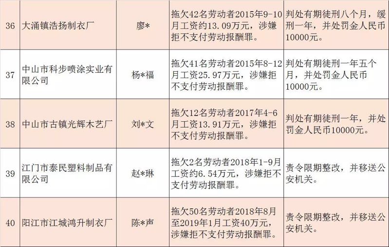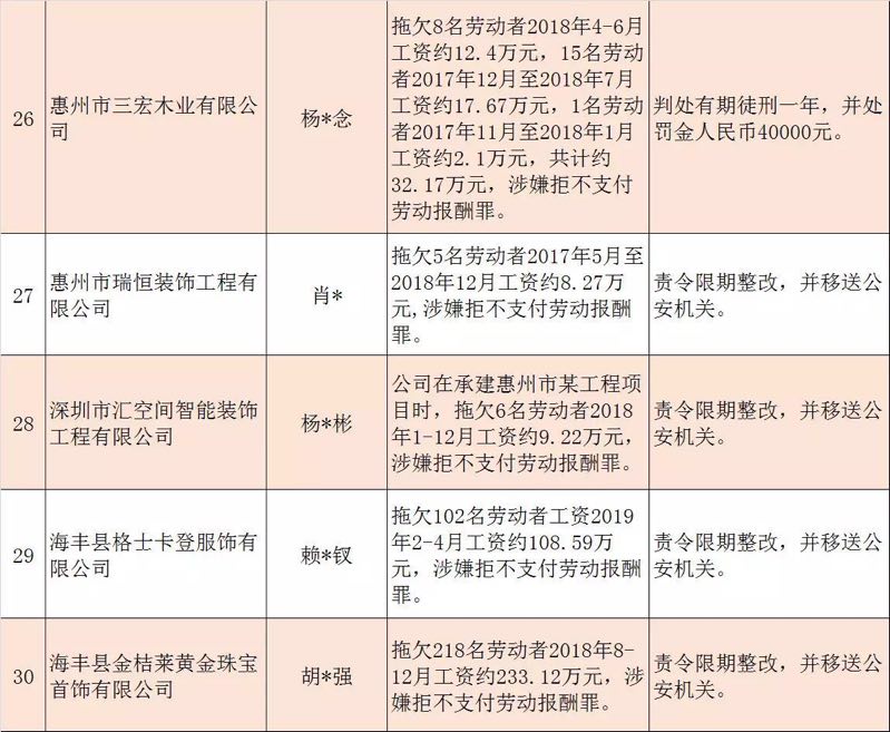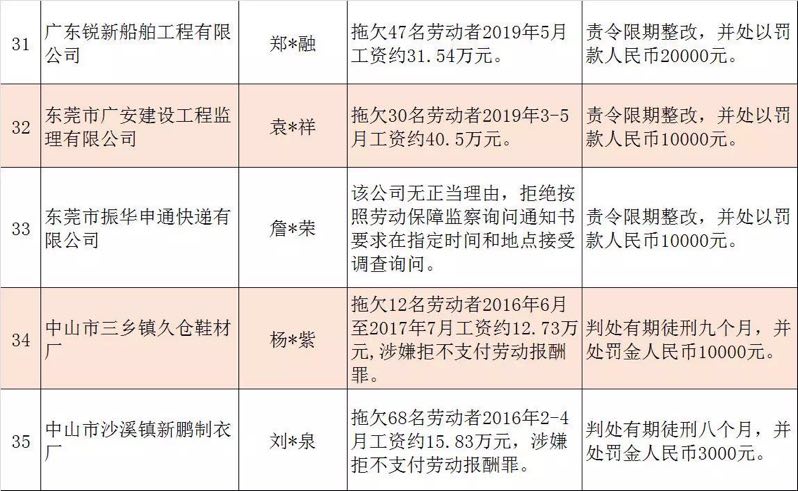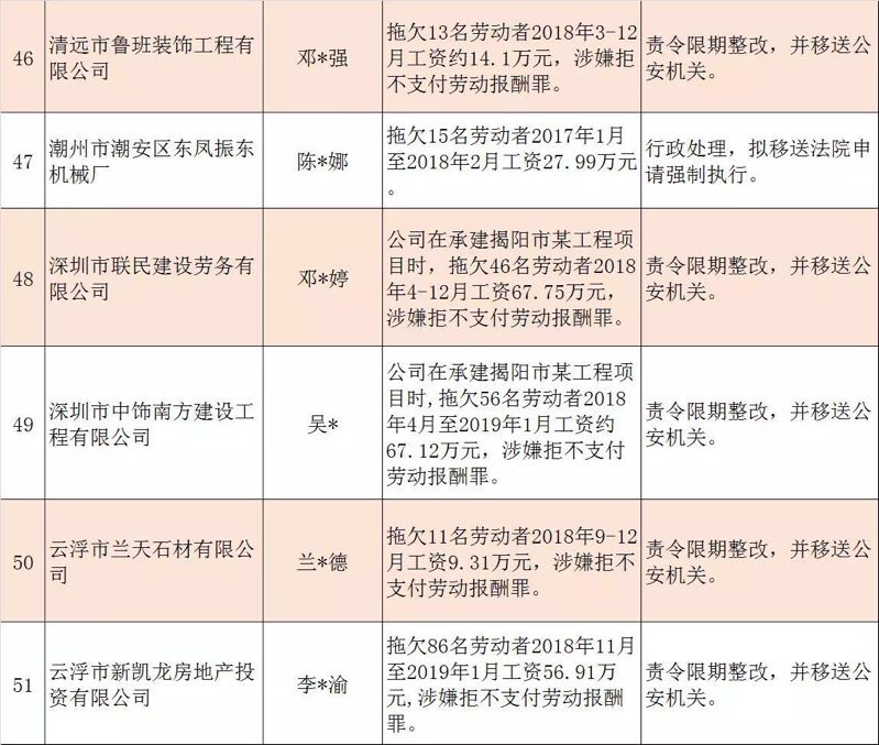 今年第二季度以來(lái),廣東省人力資源社會(huì)保障行政部門繼續(xù)加大對(duì)欠薪等重大違法行為的打擊力度,各地特別是廣州、深圳、珠海、惠州、中山等地對(duì)欠薪逃匿、欠薪屢教不改、欠薪涉及人數(shù)和金額巨大等違法行為重拳出擊,依法處罰處理,對(duì)涉嫌犯罪的堅(jiān)決移送司法機(jī)關(guān)繩之以法,切實(shí)維護(hù)勞動(dòng)者的勞動(dòng)報(bào)酬等權(quán)益。為加強(qiáng)對(duì)違法用人單位的社會(huì)監(jiān)督,強(qiáng)化誠(chéng)信體系建設(shè),加大威懾力,日前省人社廳披露了2019年第三批重大違法案件,這51家黑心企業(yè)中就有10家是深圳“揪”出來(lái)的(如圖)。