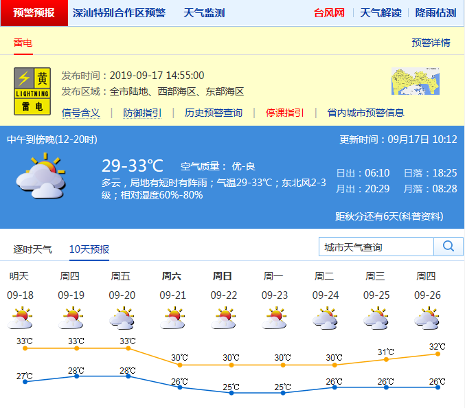 市氣象局預(yù)計(jì)寶安區(qū),福田區(qū),羅湖區(qū),南山區(qū),光明區(qū),龍華區(qū),西部海區(qū)和龍崗區(qū)(南灣、坂田、平湖、布吉、吉華街道)1-2小時(shí)內(nèi)將出現(xiàn)30-50毫米降水,深圳市氣象臺于2019年09月17日16時(shí)55分在上述地區(qū)發(fā)布暴雨黃色分區(qū)預(yù)警,全市進(jìn)入暴雨戒備狀態(tài),請注意防范。