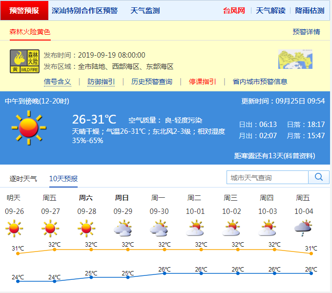 市氣象局預(yù)計26-28日持續(xù)天晴干燥,陽光充足,請注意防火用火安全;29-30日多云間晴天,偶有零星小雨;10月1-3日,晴間多云。