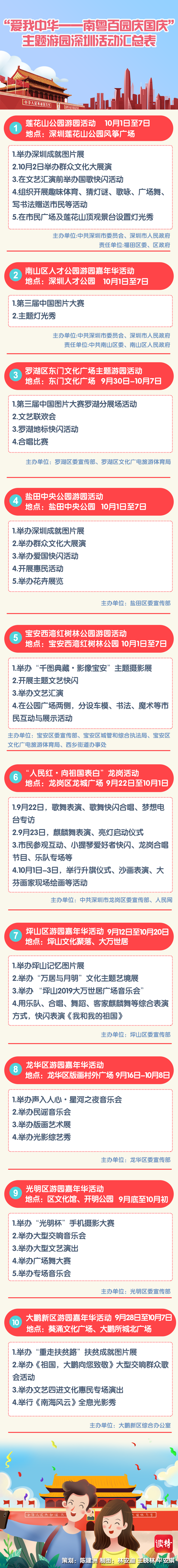 深圳特區(qū)報(bào)2019年9月26日訊 為熱烈慶祝中華人民共和國成立70周年,深圳市將舉辦規(guī)模盛大的全市性專場音樂會、群眾文藝晚會、焰火晚會等活動,同時(shí)將在各區(qū)舉辦80場“我和我的祖國”國慶群眾文藝嘉年華活動,并在全市各區(qū)舉行“愛我中華——南粵百園慶國慶”主題游園。各有關(guān)活動安排如下: