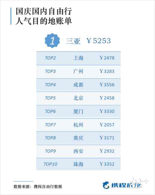 而哪些目的地在國(guó)慶期間最能吸引自由行游客?根據(jù)攜程自由行數(shù)據(jù),三亞、上海、廣州、成都、北京、廈門、杭州、重慶、西安和珠海。其中國(guó)慶前往三亞度假已經(jīng)成為潮流,單次人均花費(fèi)為5253元。
