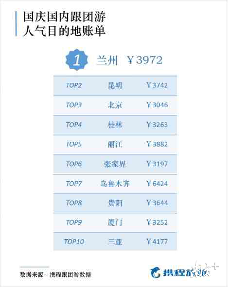 哪些國(guó)內(nèi)旅游城市是今年國(guó)慶的贏家?根據(jù)攜程跟團(tuán)游,最受游客歡迎的國(guó)內(nèi)旅游城市前十分別是蘭州、昆明、北京、桂林、麗江、張家界、烏魯木齊、貴陽(yáng)、廈門和三亞。其中前往蘭州人均花費(fèi)近4000元。