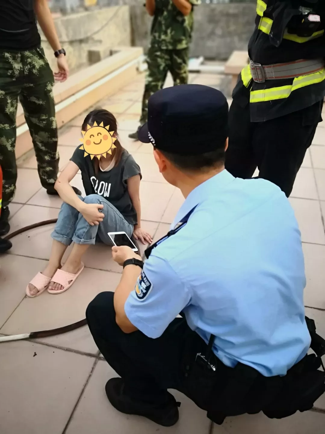 近日,深圳市公安局福田分局沙頭派出所接到群眾求助電話稱,其朋友疑似醉酒欲輕生。接警后,民警盧建明在5分鐘內(nèi)迅速趕到現(xiàn)場,發(fā)現(xiàn)當(dāng)事人梁女士坐在樓頂圍墻上啼哭,多次嘗試與梁女士溝通后都沒有得到回復(fù)。但梁女士對盧建明很是信任,把手機(jī)信息給盧建明查看。盧建明得知梁女士因感情受挫產(chǎn)生輕生想法,撥打其男友電話卻始終聯(lián)系不上。盧建明擔(dān)心其長時(shí)間哭泣身體承受不住,容易發(fā)生意外,便采取強(qiáng)制救助措施。自己在前與梁女士交談分散她的注意力,安排隊(duì)員從后面將她救助到安全地方,并將她帶到社區(qū)工作站,在耐心的交談中解開她的心結(jié),讓她放下包袱,重新生活。