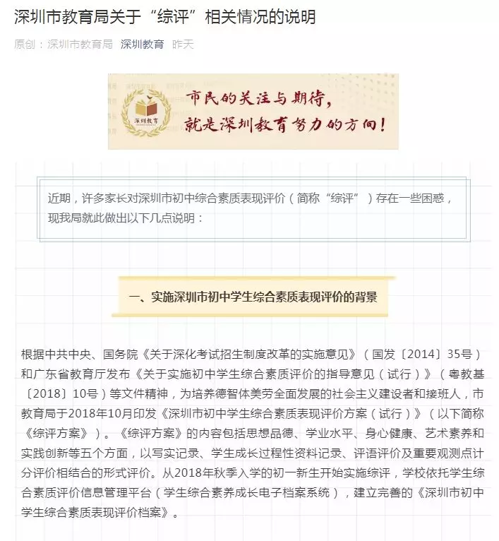 《深圳市初中學(xué)生綜合素質(zhì)表現(xiàn)評價方案(試行)》(以下簡稱《綜評方案》)于2018年10月印發(fā)。