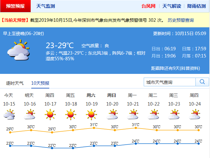 見圳客戶端·深圳新聞網2019年10月15日訊 記者從深圳市氣象局了解到,今日深圳多云,可見陽光;氣溫23-29℃,有些許涼意;東北風3級,沿海、高地和海區(qū)最大陣風7-8級;16-21日再轉晴天干燥天氣,早晚氣溫舒適,適宜戶外活動。