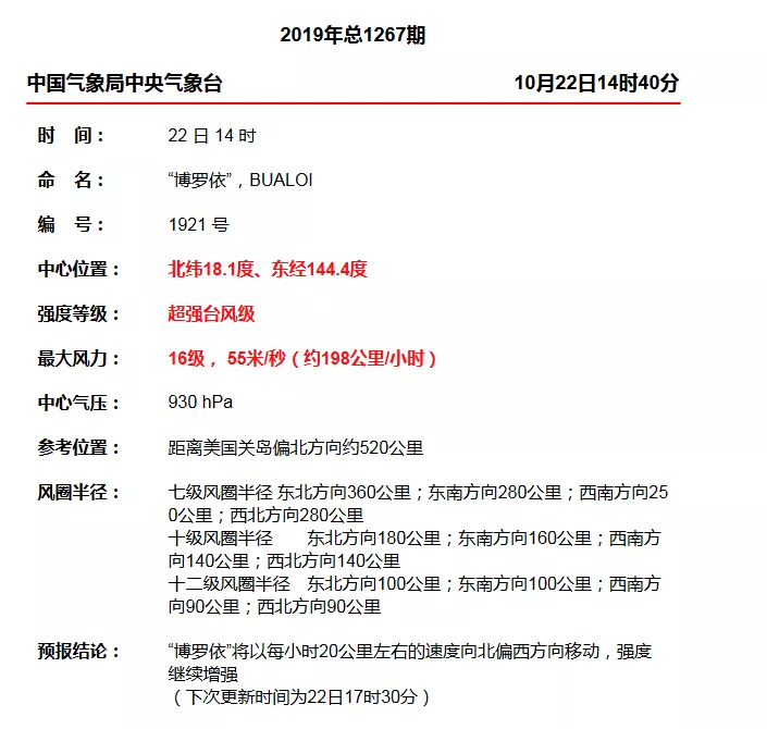 今年第21號(hào)臺(tái)風(fēng)“博羅依”已于10月22日凌晨加強(qiáng)為強(qiáng)臺(tái)風(fēng)級(jí),早晨5點(diǎn)鐘其中心位于美國關(guān)島北偏東方向約370公里的西北太平洋洋面上,就是北緯16.7度、東經(jīng)145.5度,中心附近最大風(fēng)力有14級(jí)(42米/秒),中心最低氣壓為955百帕,七級(jí)風(fēng)圈半徑180-280公里,十級(jí)風(fēng)圈半徑100-160公里,十二級(jí)風(fēng)圈半徑50-80公里。
