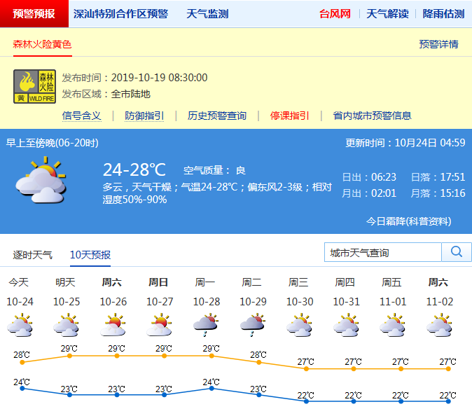 北方因?yàn)榻禍?,人們早已套上毛衣、穿起秋褲,深圳的小伙伴還在穿著夏裝。昨天白天,全市晴天間多云,早晚較清涼,最低氣溫21℃-23℃,最高氣溫29℃-30℃。全市森林火險(xiǎn)黃色預(yù)警信號生效中。