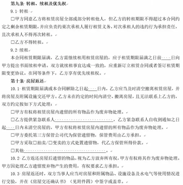4、增設(shè)承租人下落不明時(shí),出租人對(duì)租賃房屋內(nèi)的遺留物處理?xiàng)l款。實(shí)踐中,存在很多承租人無力支付租金時(shí)斷絕與出租人聯(lián)系的情形。為解決出租人無法聯(lián)系承租人時(shí)對(duì)租賃房屋內(nèi)遺留物的處理問題,新版合同增設(shè)承租人未按約定交還房屋且下落不明時(shí)遺留物的處理?xiàng)l款,由雙方當(dāng)事人在簽訂合同時(shí)就此問題協(xié)商一致,避免出租人遭受無法收回房屋導(dǎo)致房屋使用價(jià)值無法實(shí)現(xiàn)的損失或者因自行處置遺留物引起糾紛、面臨侵權(quán)責(zé)任的風(fēng)險(xiǎn),有效解決承租人下落不明時(shí)租賃房屋內(nèi)遺留物的處理問題。