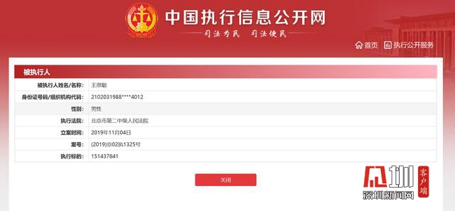 有媒體發(fā)現(xiàn)中國執(zhí)行信息公開網(wǎng)上于11月4日新增了王思聰?shù)囊粭l被執(zhí)行人信息,執(zhí)行標(biāo)的為1億5143萬7841元,執(zhí)行法院為北京市第二中級人民法院。巧合的是,網(wǎng)友發(fā)現(xiàn)王思聰微博設(shè)置為半年可見。