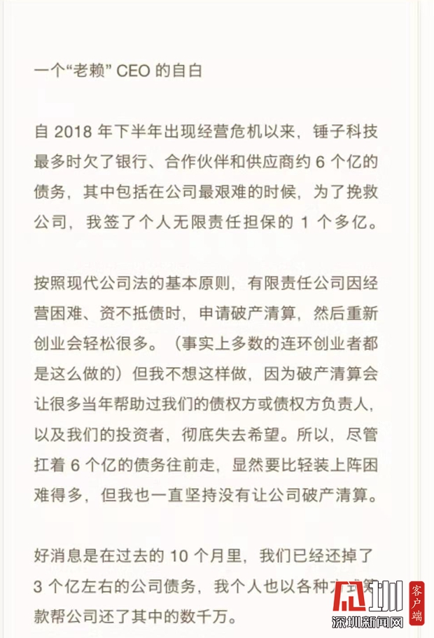 再早幾天,錘子科技CEO羅永浩進入失信人名單,被丹陽法院下了限制消費令。羅永浩隨后在自己的個人公眾號上發(fā)布了《一個“老賴”CEO的自白》,稱自己為了挽救公司,簽了個人無限責(zé)任擔(dān)保的1個多億,強調(diào)會把債務(wù)全部還完。