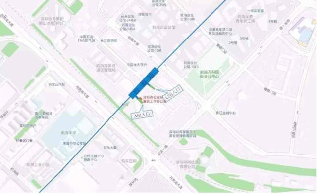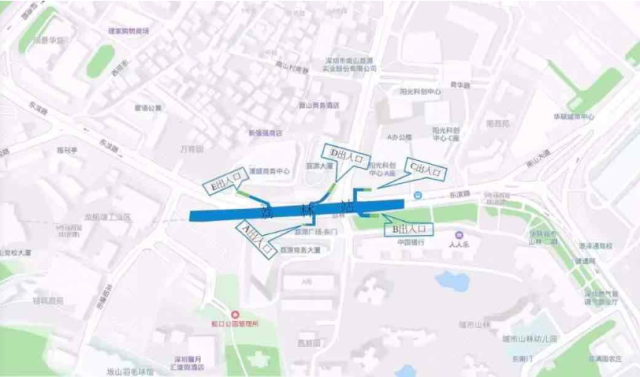高新南站位于白石路上沿白石路東西向布置,車站出入口共計(jì)4個(gè),其中A、B出入口接科技生態(tài)園,C出口靠豪威科技大廈,D出口通向科技南路方向。