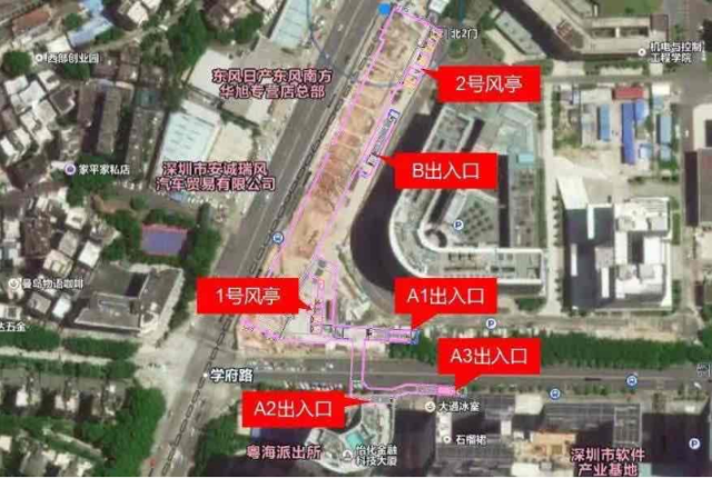 深大南站位于學(xué)府路與白石路交界處北側(cè),車站出入口共計(jì)4個(gè):A1出入口、A2出入口、A3出入口、B出入口,其中A1出入口位于深圳大學(xué)基礎(chǔ)實(shí)驗(yàn)樓一期南側(cè),B出入口位于深圳大學(xué)基礎(chǔ)實(shí)驗(yàn)樓一期西側(cè)