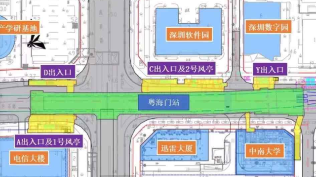 粵海門站位于白石路與科苑南路交叉口處,車站出入口共計(jì)4個(gè),其中A出入口位于電信大樓旁,D出入口位于深港產(chǎn)學(xué)研基地旁,C、Y出入口位于白石路北側(cè),靠近深圳軟件園及數(shù)字園。