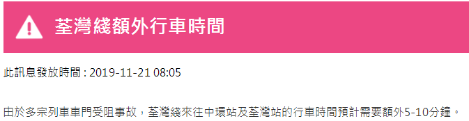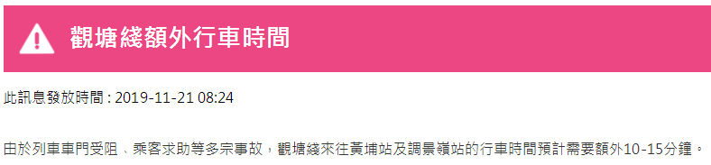此外,目前,由于列車車門受阻,乘客求助等多宗事故,港島線來往堅尼地城站及柴灣站、荃灣線來往中環(huán)站及荃灣站、觀塘線來往黃埔站及調(diào)景嶺站,行車時間預(yù)計需要額外10至15分鐘。
