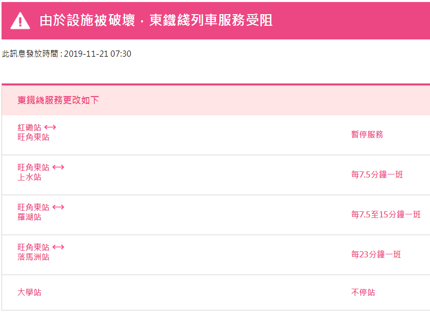 據(jù)港鐵消息,11月21日,香港地鐵各線(機場快線除外)、輕鐵及港鐵巴士的服務(wù)將于晚上11時結(jié)束。西鐵線/東鐵線紅磡站及大學(xué)站繼續(xù)關(guān)閉。需要注意的是,元朗站將于下午2時關(guān)閉,列車不停元朗站,此外,個別車站出入口會暫時關(guān)閉。