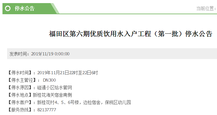 停水客戶:新桂花村4、5、6號樓,邊檢宿舍,保稅區(qū)幼兒園