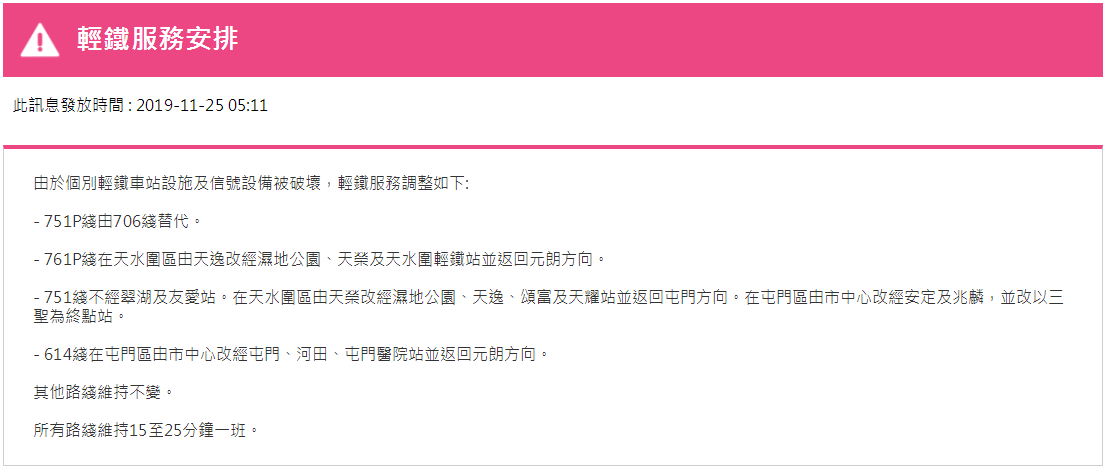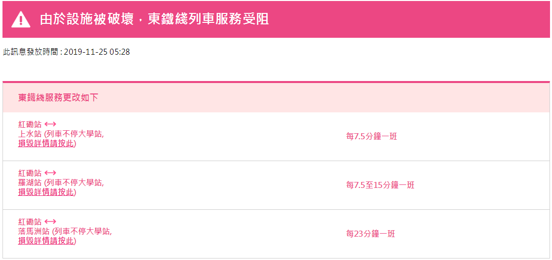 據(jù)港鐵消息,11月25日,香港地鐵各線(機(jī)場快線除外)、輕鐵及港鐵巴士的服務(wù)將于晚上11時(shí)結(jié)束。紅磡站恢復(fù)列車服務(wù),但只開放B、C出入口。大學(xué)站繼續(xù)關(guān)閉,列車不停大學(xué)站,個(gè)別車站出入口也會(huì)暫時(shí)關(guān)閉。