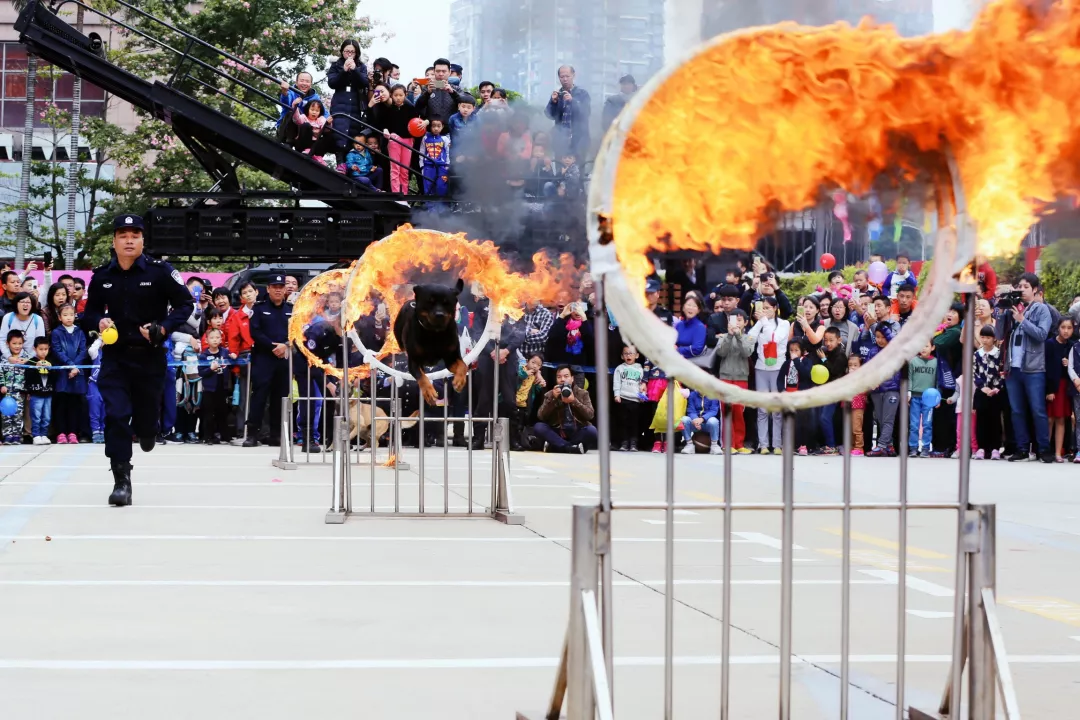 演出科目:躍障、撲咬、跳火圈等