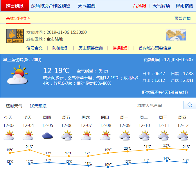 見圳客戶端·深圳新聞網(wǎng)2019年12月3日訊 近兩日,深圳風力清勁,不少市民反饋“終于有個秋天的樣子”。記者從市氣象臺獲悉,預計3日晴天間多云,空氣非常干燥,氣溫12℃至19℃,陣風6級至7級。4日氣溫短暫回升,氣溫12℃至21℃。5日至7日冷空氣繼續(xù)補充影響,風力再次加大,氣溫進一步下降。其中,5日氣溫13℃至17℃,6日氣溫12℃至17℃,7日氣溫11℃至17℃。