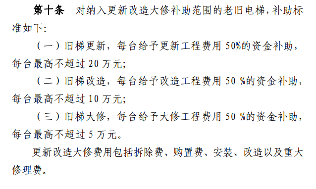 (三)舊梯大修,每臺(tái)給予大修工程費(fèi)用50 %的資金補(bǔ)助,每臺(tái)最高不超過5萬元。